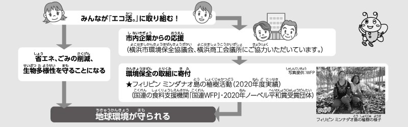 夏に、横浜市内の小学生(4・5年生)が、「エコライフ・チェックシート」を使って、省エネや生物多様性の保全、3Rなどの環境行動に取り組みます。その取組を企業が応援し、企業の皆様からの協賛金を国連WFP協会を通じて、海外での環境保全活動に寄付をしています。子どもたちと企業が「地球の環境を守る」という同じ目標に向かい取り組みます。