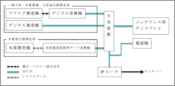 市内各地に設置された一般大気環境、大気発生源、水質発生源測定局に設置される子局装置は、その測定局に設置してある測定機(硫黄酸化物やオキシダント等)から測定値等を取得します。ただし、発生源測定局の場合は事業者が提供する測定値データを取得します。このデータ取得は、定期的(毎分)自動的に行われ、中央局からのデータ要求信号に応答して中央局装置へ送信します。測定局に設置される測定機がデジタル測定機の場合は、子局装置はイーサネットを使用したTCP/IP通信によりデジタル測定機から直接データを取得します。また、測定機がアナログ測定機の場合は、子局装置はイーサネットを使用したTCP/IP通信により、アナログ測定機のデータをデジタル変換機(アナログ値をデジタル信号に変換する装置)経由で取得します。特に、水質発生源測定局の場合は、子局装置はイーサネットを使用したTCP/IP通信により、負荷量演算器からのデータを負荷量演算器用データ変換機経由で取得します。