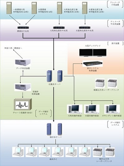 このシステムは、測定局の測定データを収集する「測定局データ収集システム」と、測定局の制御や測定データを帳票出力する「制御・監視・解析・帳票出力システム」から構成されます。