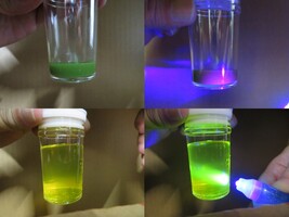 午前は、紙と水で水性ペンの色を分ける実験を、午後は、植物をすりつぶしてろ過し、蛍光する物質を観察する実験をします。