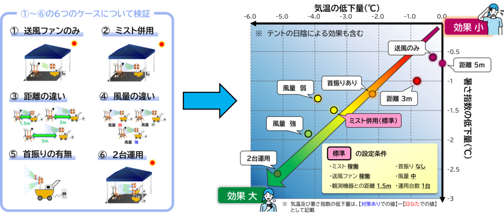 検証の結果、日なたに設置する場合や距離が5m以上離れてしまう場合は、暑熱緩和効果が小さく、風量を強くしたり、運用台数を2台に増やした場合は、暑熱緩和効果が大きいことが分かりました。
