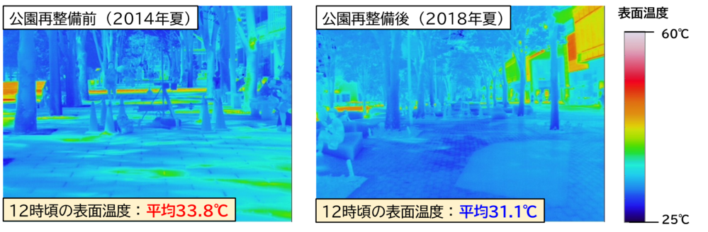 再整備前と比べ、緑が増えて大きな緑陰が形成された効果により、気温や表面温度などが下がり、夏の暑熱環境が緩和していることを確認しました。