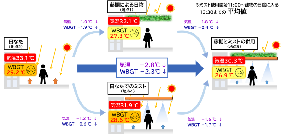 さらにミストと藤棚の日陰を組み合わせた場所では、WBGTなどの体感温度が最も改善されており、日陰と効率良く組み合わせることで、より一段と暑熱環境を緩和する効果が期待できます。
