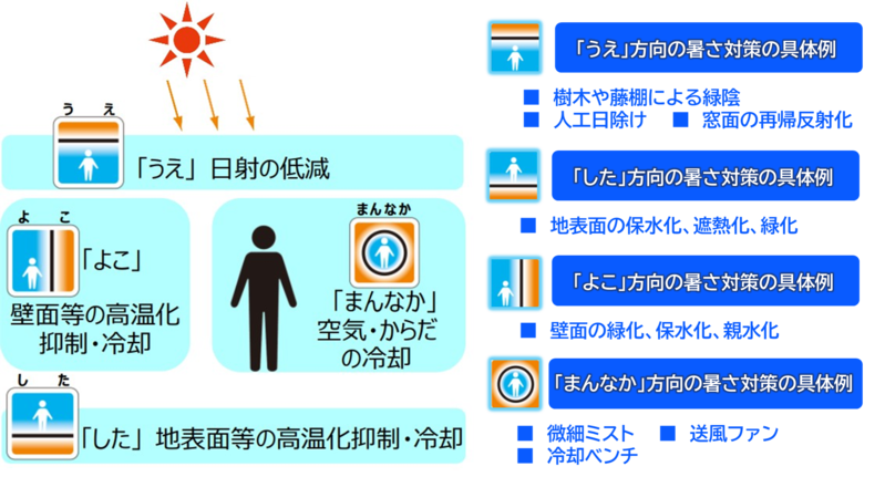 暑さ対策の手法は方向別に「うえ」方向、「した」方向、「よこ」方向、「まんなか」の4つに分けることができます。