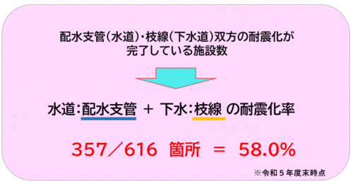 重点的に耐震化を実施している、重要施設に接続する水道・下水道の管路は、令和5年度末時点で約6割で耐震化が完了しています。