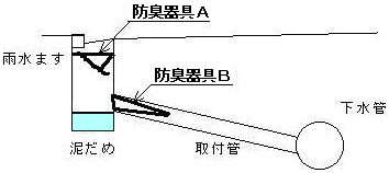 合流式下水道区域の道路に設置されている雨水ますは、汚水と雨水を一緒に排水しているため、雨水ますから下水の臭気がする場合があります。このような場合は、下図のような防臭器具A又は防臭器具Bを雨水ますに取付け、下水本管からの臭気を防ぎます。
