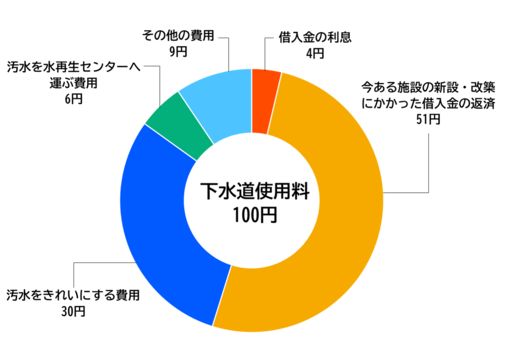 右のグラフは下水道使用料を100円に換算して使い道を表したものです(2022年度決算値より)。