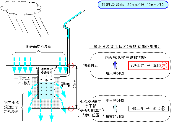 - 雨水浸透ますの砕石外側から30cmの範囲内の土壌水分の上昇は、4%程度にとどまり、実験終了後30分程度で、初期の状態に回復しました。