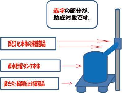 助成対象は、雨水貯留タンク1基(連結する場合は2基以上でも可)およびその付属品(転倒防止チェーン、置台、接続に必要な部材等)です。