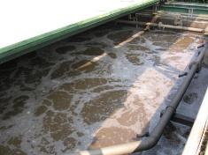 反応タンク内では汚水と活性汚泥が混じっています。白い泡は空気です。