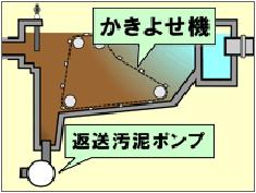 沈殿した活性汚泥をかきよせ機で集め、返送汚泥ポンプにより再び反応タンクに送ります。