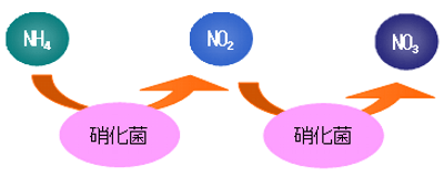 硝化反応は硝化菌の働きで、アンモニアを硝酸(NO3)にする反応です。好気槽で行われます。硝化菌は、酸素を使ってアンモニアを硝酸に酸化します。模式図で表すと次のようになります。