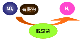 脱窒反応は、脱窒菌の働きで、硝酸を窒素ガス(N2)に還元する反応です。無酸素槽で行われます。(1)の硝化反応により生成した硝酸の一部は、循環ポンプにより無酸素槽に戻ります。脱窒菌は、酸素のないところでは硝酸を使って有機物からエネルギーを取り出します。このとき、硝酸が窒素ガスに還元されます。模式図で表すと次のようになります。