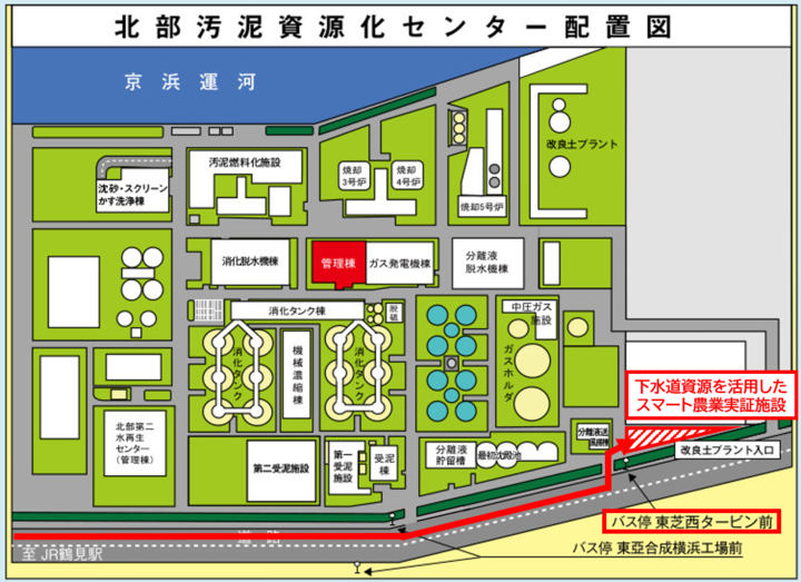循環型社会構築への貢献と農業のスマート化に向け、北部下水道センター(北部汚泥資源化センター、鶴見区)内の農業用ハウスにおいて、スマート農業機器により温湿度等を制御した環境下で、下水再生水や下水熱等の下水道資源を活用した栽培実証を行います。