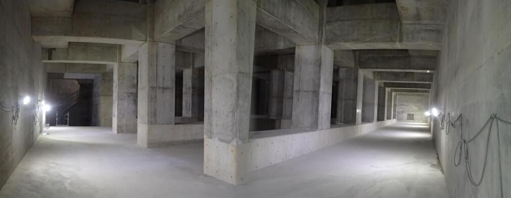 9 雨水調整池内の状況③:地下に広がる大空間は25mプール約43杯分の水を溜めることができます。※25mプールを長さ25m×幅12m×深さ1.2mとしたときの計算で表しています。