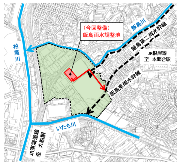 栄区飯島町(飯島地区南部)における地盤の低い地域(低地区)では、過去より浸水被害が発生していることから、10年確率降雨(1時間当たり約60㎜の降雨)に対する浸水被害の軽減を図り、安全を確保するために雨水を貯留する飯島雨水調整池の整備を行うものです。