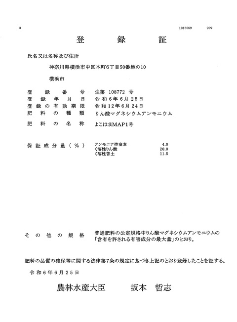 回収した再生リンは、肥料原料として利用できるよう農林水産省に肥料登録をしています。