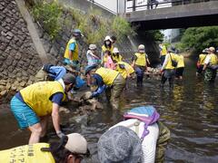 当日は生物の専門家である川づくりコーディネーターから生き物調査のやり方の説明を伺った後、30名前後の小さい子から大人まで自らタモ網を持って宮川に棲む生き物を調べました。