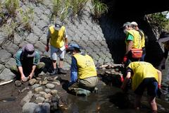 活動内容として、石組み水制工による生き物のすみか作りや、現在も実施している、活動参加者の