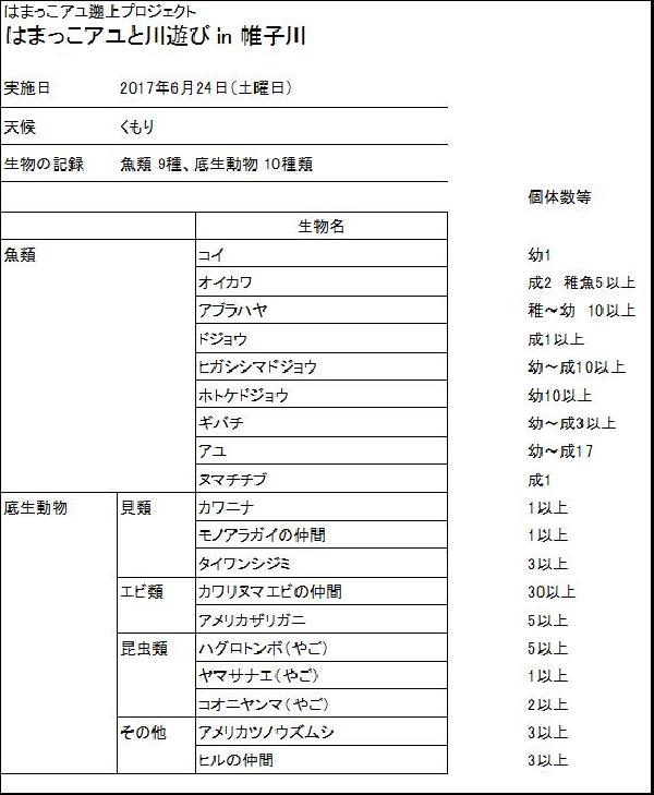 アユは幼魚~成魚を含めて計17匹が採捕されました。その他の生物については、