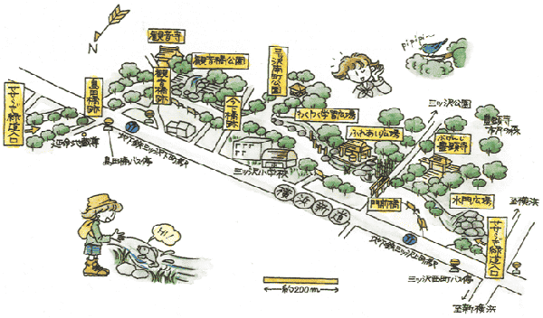 反町川跡地が、周辺の自然を残しながら、地下鉄に湧く地下水を使って心地よいせせらぎに。交通量の多い国道1号線が近くを走っているとは信じられないような、静けさです。噴水広場や水生動物の観察場所もあり、近くには「豊顕寺(ぶげんじ)市民の森」、そのまま足をのばせば三ッ沢公園へ。