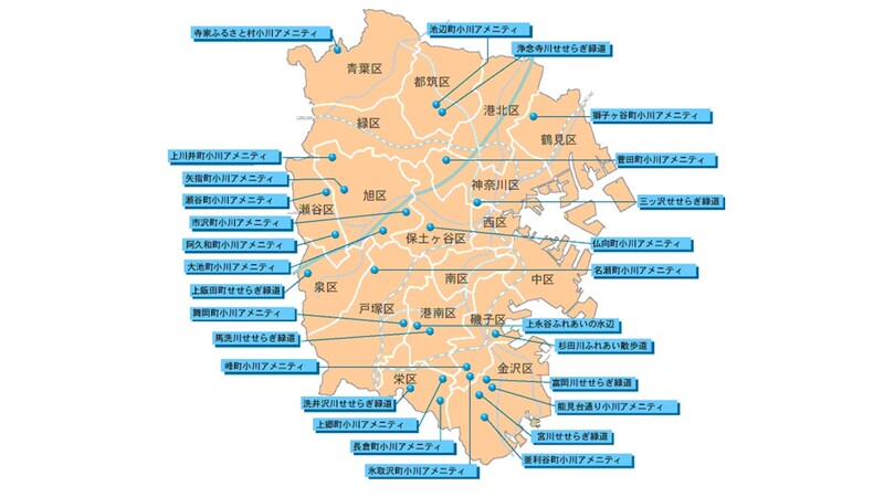 横浜市には、水辺に親しめるように整備された小川アメニティやせせらぎ緑道等があります。