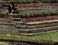 かもめ橋上流では、旧河川敷を利用して階段護岸と水際に、高水敷を設置し川沿いの花壇を作りました。また、五軒橋周辺ではバス停と一体的に整備しました。