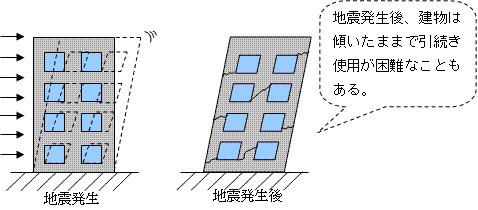 この設計はあくまでも人命確保が目標で、建物は損傷し、傾き、引続き使用できない可能性があります。新耐震基準に導入された考えです。