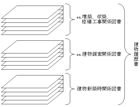 建物履歴書とは、各々の建物の確認申請などの手続きの状況や検査の有無、設計図書の保存状況だけでなく、新築後の維持管理段階における調査、修繕や増改築の履歴などを整理し、まとめたものです。