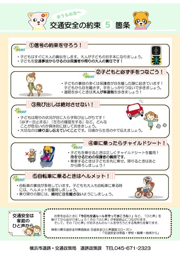 保護者のみなさまに必ず覚えておいていただきたい交通安全の約束を、5つのポイントにまとめたチラシです。
