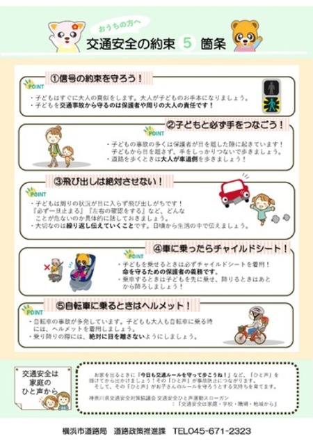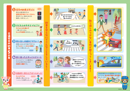 保護者のみなさまに必ず覚えておいていただきたい交通安全の約束を、5つのポイントにまとめたチラシです。