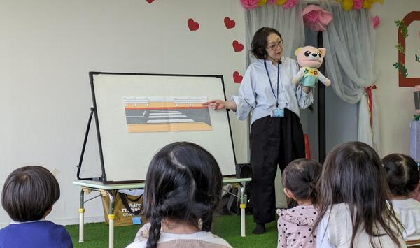 幼稚園保育園に行って、みんなと一緒に交通ルールの勉強をしているよ