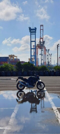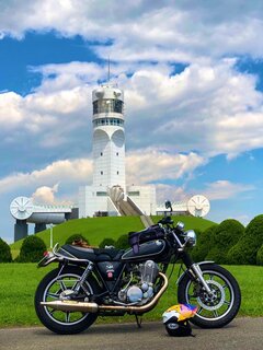 横浜港シンボルタワーと青空に、雲がドラマチックに演出を助け、エンジンの音が聞こえてきそうです。とても気持ちの良い日にツーリングしたようですね。しゃがんだ位いの低い位置からのアングル(ローアングル)が、タワーもバイクも引き立てています。