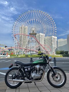 KAWASAKIの名車が、コスモワールドのコスモクロック21(観覧車)やダイビングコースターとコラボしています。KAWASAKI好きにはZ派やW派がいる様ですが、特徴的なスポークやディスクブレーキはこのバイクの魅力ですね。清々しい空と遊園地に愛車がキリッと佇んでいる様に見えます。