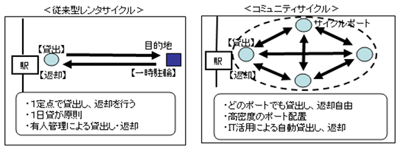 - 一定のエリアで複数の貸出拠点を設置し、どのポートでも貸出し、返却が可能なシステム