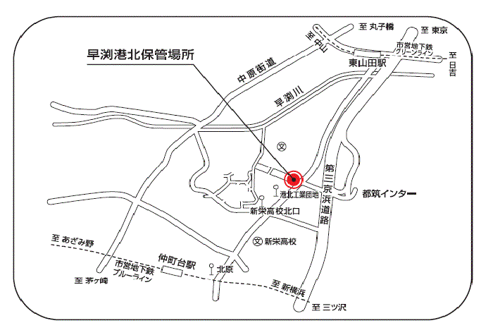 地下鉄、東山田駅前から道路標識「新横浜」方面へ右折して、道路右側を直進、「都筑インター入口」の信号右側が保管場所です。