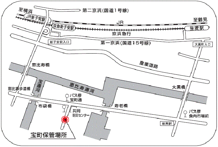 駅前バス乗り場から市営バス(19系統)「生麦駅」行きに乗車し、四つ目の停留場『宝町通』で下車。バスの進行方向に進み、信号機のある道路を横断し約10m直進すると、左側が保管場所です。