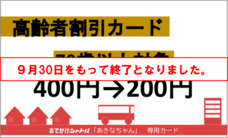 - 令和7年10月1日 あきなちゃんで敬老特別乗車証(敬老パス)、福祉特別乗車券(福祉パス)、特別乗車券、回数券ICカードが使えるようになりました。