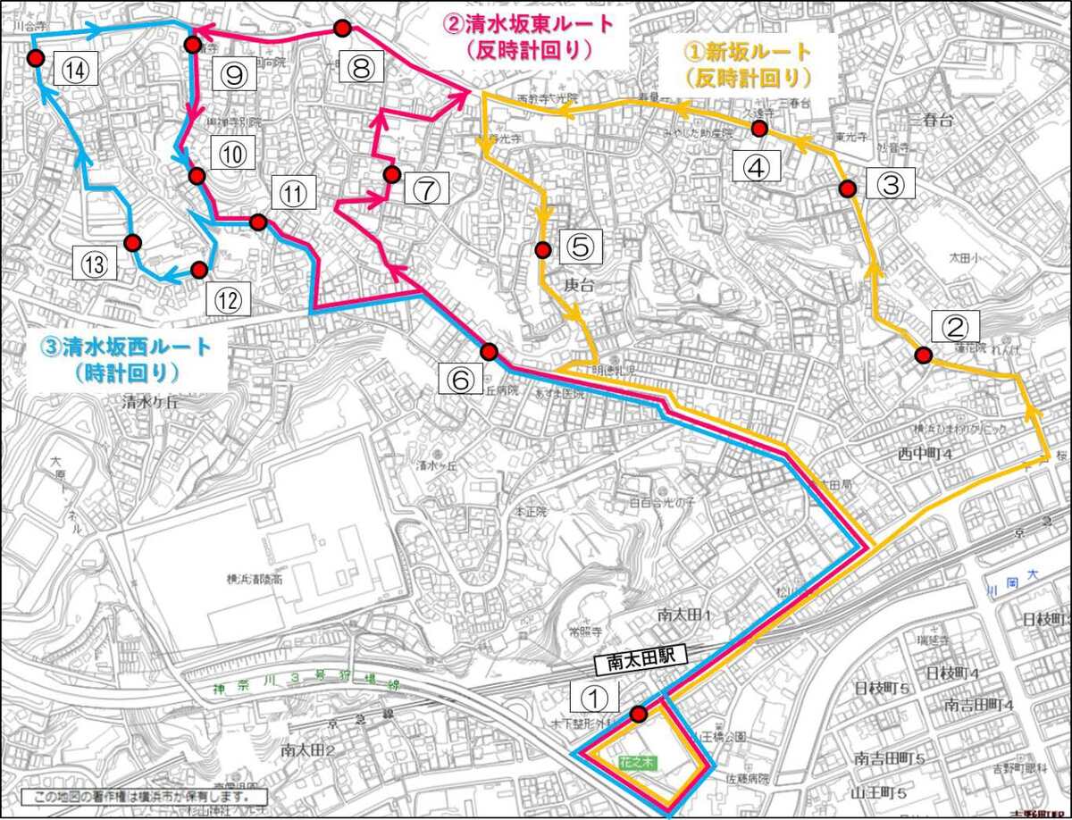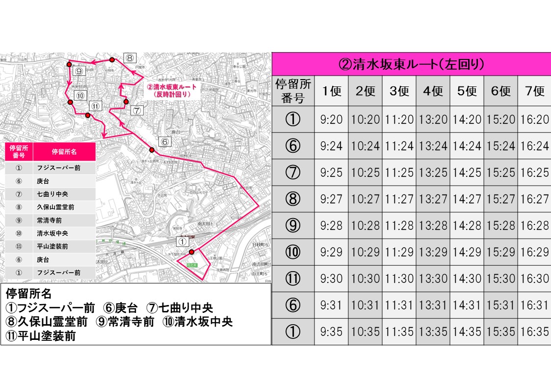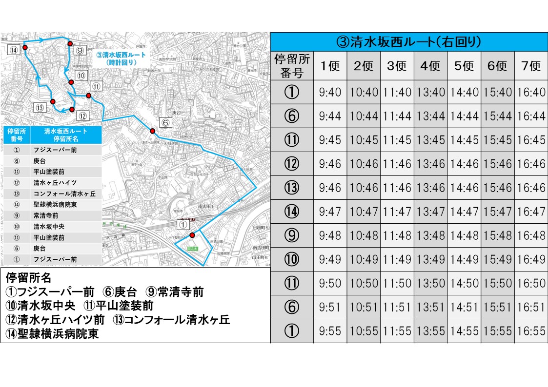 (①フジスーパー前(PDF:132KB)、②れんげ院(PDF:99KB)、③さいとう美容室前(PDF:106KB)、④角清前(PDF:98KB)、⑤庚坂中央(PDF:652KB)、⑥庚台(PDF:136KB)、⑦七曲り中央(PDF:90KB)、⑧久保山霊堂前(PDF:94KB)、⑨常清寺前(PDF:102KB)、⑩清水坂中央(PDF:90KB)、⑪平山塗装前(PDF:118KB)、⑫清水ヶ丘ハイツ前(PDF:80KB)、⑬コンフォール清水ヶ丘(PDF:78KB)、⑭聖隷横浜病院東(PDF:108KB))