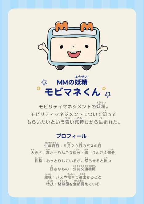 - 動画では、MMの妖精「モビマネくん(画像:28KB)」が、モビリティマネジメントについて分かりやすく説明しています。