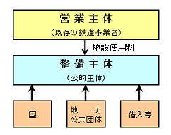 施設を整備する整備主体と、運行を行う営業主体を分離する、上下分離方式による制度です。整備主体は国と地方公共団体の補助を受け、残りの事業費を資金調達して施設を整備します。営業主体は整備主体に施設使用料を支払い運行を行います。