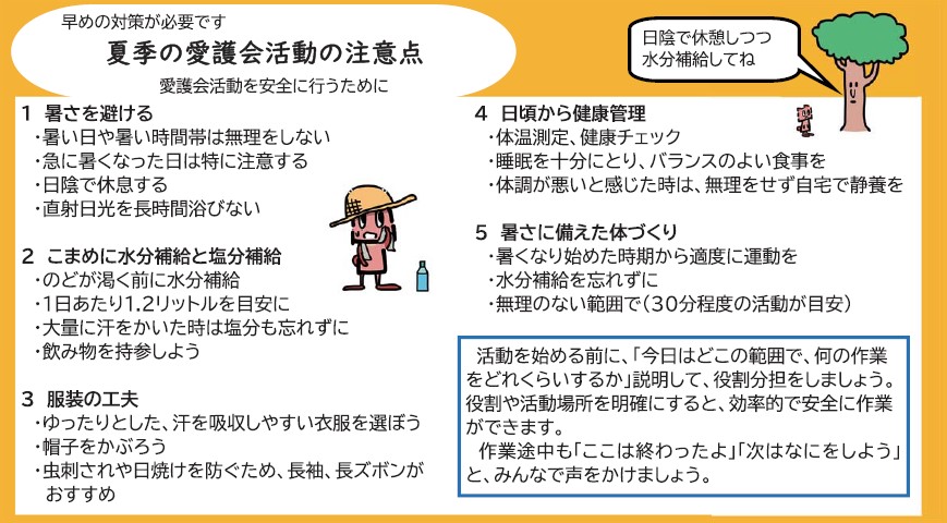 愛護会活動を、楽しく安全に続けていただくためにも、予防のポイントを活動前に確認することが大切です。