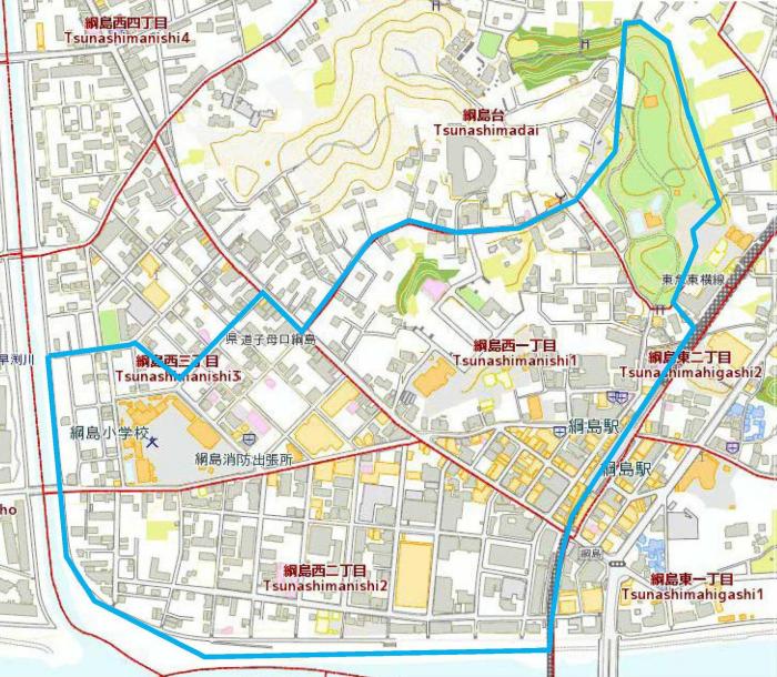 ①丘の緑の拠点:綱島公園 ②まちの緑の拠点:綱島地区センター(以後:地区センター) ③川辺の緑の拠点:河川敷の自然。
