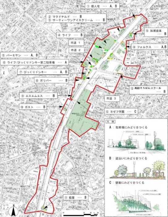 - 幹線道路沿道の民有地に、みどりの中で憩うことができる持続可能で生物多様性の植栽ゾーン、「みどりの拠点」をつくります。