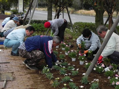 協議会員の市民と企業が協力し合い、花壇づくりの作業中