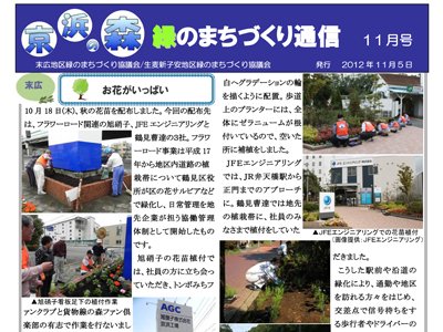 - 「京浜の森づくり」を先導する地区として、豊かな環境の産業拠点づくりに向け、地域の緑や海に開かれた水際空間などの魅力を活かして、緑と水と生きものが相乗して奏でる協奏曲が聞こえてくる地域環境を形成するため、公・民の協働による「地域緑のまちづくり事業」に取り組みます。