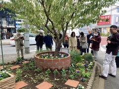 活動報告の様子(綱島地区センターにて) 緑化場所の見学・説明(ピーチ花壇)