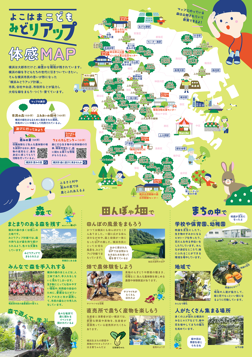 「よこはまこどもみどりアップ」は小学生を主な対象とした、横浜みどりアップ計画の取組を体感できる場所をまとめた地図や、横浜みどりアップ計画の緑をまもり、つくり、育む取組についてご紹介したリーフレットです。