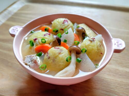 さつまいものお団子をたっぷりのお野菜と一緒に食べられるようにみんなの好きな豚汁に入れてみました。さつまいもがなめらかになるまでしっかりと練ることがもっちもちになるポイントです!