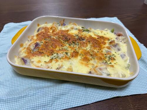 グラタンが好きで、さつまいもを入れて作ったらおいしいかなと思って、お⺟さんと一緒に作りました。家族にも喜んでもらえました。他の材料で作っても美味しかったです。良かったら作ってみてください!